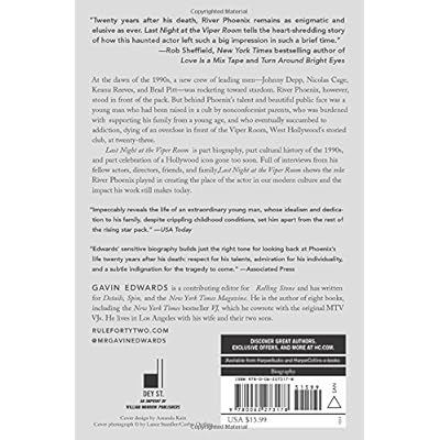 Review “Twenty years after his death, River Phoenix remains as enigmatic and elusive as ever. Last Night at the Viper Room tells the heart-shredding story of how this haunted actor left such a big impression in such a brief time.” (Rob Sheffield, New York Times bestselling author of Love Is a Mix Tape)“What Edwards does do impeccably is reveal the life of an extraordinary young man, whose idealism and dedication to his family, despite crippling childhood conditions, set him apart from the rest of the rising star pack.” (USA Today) Read more From the Back Cover At the dawn of the 1990s, a new crew of leading men—Johnny Depp, Nicolas Cage, Keanu Reeves, and Brad Pitt—was rocketing toward stardom. River Phoenix, however, stood in front of the pack. But behind Phoenix's talent and beautiful public face was a young man who had been raised in a cult by nonconformist parents, who was burdened with supporting his family from a young age, and who eventually succumbed to addiction, dying of an overdose in front of the Viper Room, West Hollywood's storied club, at twenty-three.Last Night at the Viper Room is part biography, part cultural history of the 1990s, and part celebration of a Hollywood icon gone too soon. Full of interviews from his fellow actors, directors, friends, and family, Last Night at the Viper Room shows the role River Phoenix played in creating the place of the actor in our modern culture and the impact his work still makes today. Read more See all Editorial Reviews